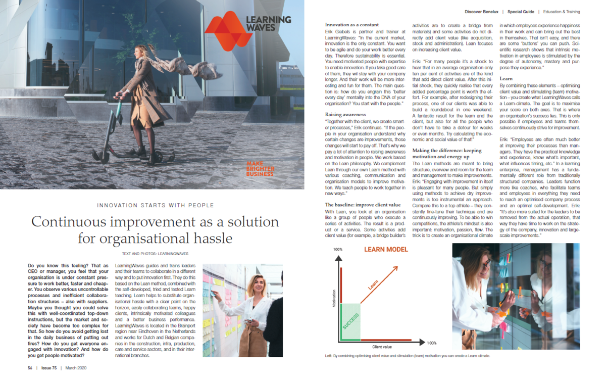 LearningWaves guides and trains leaders and their teams to collaborate in a different way and to put innovation first. They do this based on the Lean method, combined with the self-developed, tried and tested Learn teaching. Learn helps to substitute organisational hassle with a clear point on the horizon, easily collaborating teams, happy clients, intrinsically motivated colleagues and a better business performance. LearningWaves is located in the Brainport region near Eindhoven in the Netherlands and works for Dutch and Belgian companies in the construction, infra, production, care and service sectors, and in their international branches.