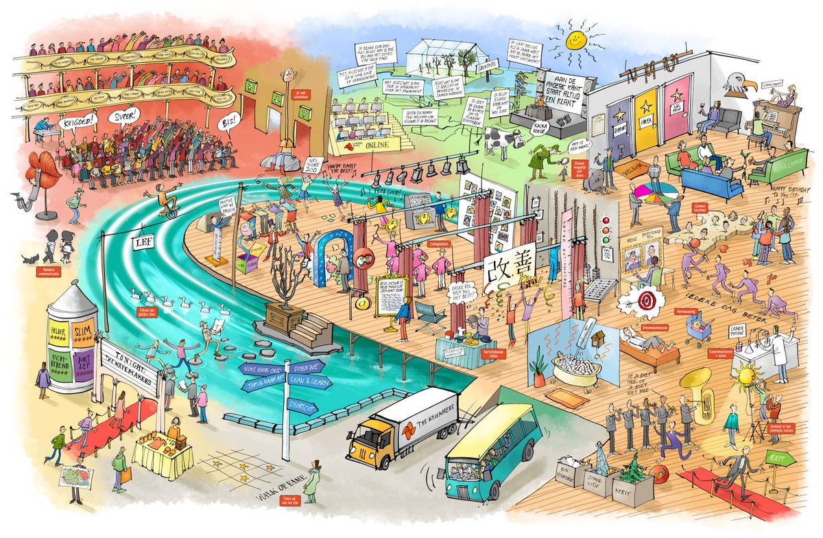 Begin 2020 lieten we een tekening maken van onze historie en toekomstvisie als organisatie. Daar kregen we zulke leuke reacties op. Wat als we nu ook wie we zijn en hoe we ons gedragen, met al onze symboliek, zouden uittekenen? We vroegen de tekenaar er weer bij en benoemden alle zaken die voor ons belangrijk zijn. Dat is een prachtige poster geworden waarin iedereen zich kan herkennen. Het is een mooie praatplaat om nieuwe collega’s mee te nemen in onze cultuur.