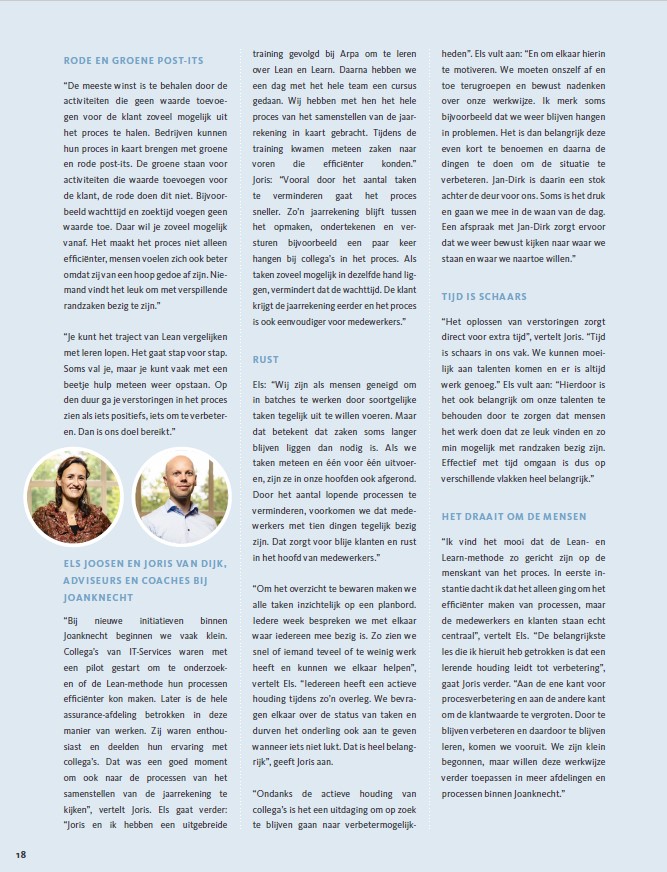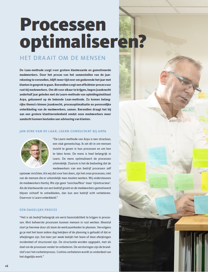 De Lean-methode zorgt voor grotere klantwaarde en gemotiveerde medewerkers. Door het proces van het samenstellen van de jaarrekening te versnellen, blijft meer tijd over om gedurende het jaar met klanten in gesprek te gaan. Bovendien zorgt een efficiënter proces voor rust bij medewerkers. Om dit voor elkaar te krijgen, begon Joanknecht anderhalf jaar geleden met de Learn-methode van opleidingsinstituut Arpa, gebaseerd op de bekende Lean-methode. Zo komen belangrijke thema’s binnen Joanknecht, procesoptimalisatie en persoonlijke ontwikkeling van de medewerkers, samen. Bovendien draagt het bij aan een grotere klanttevredenheid omdat onze medewerkers meer aandacht kunnen besteden aan advisering van klanten.