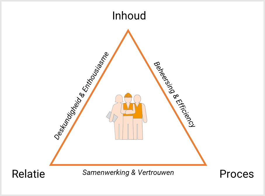 Alleen maar proces en inhoud zorgt weliswaar voor productiviteit en efficiëncy, maar ook voor een hol en zielloos systeem. Alleen maar proces en relatie dient geen doel en is bureaucratisch en inhoudsloos. Je kunt samen nog zo goed zijn in plannen, als je geen goed idee, product of dienst hebt, ben je zinloos bezig. Dit zal overigens in de praktijk zelden voorkomen. Alleen maar relatie en inhoud geeft een wetenschappelijke of (vak)broederlijke situatie en geen vooruitgang. Je kunt het heerlijk met elkaar eens of oneens zijn en een glas bier drinken. Maar er gebeurt niks.
