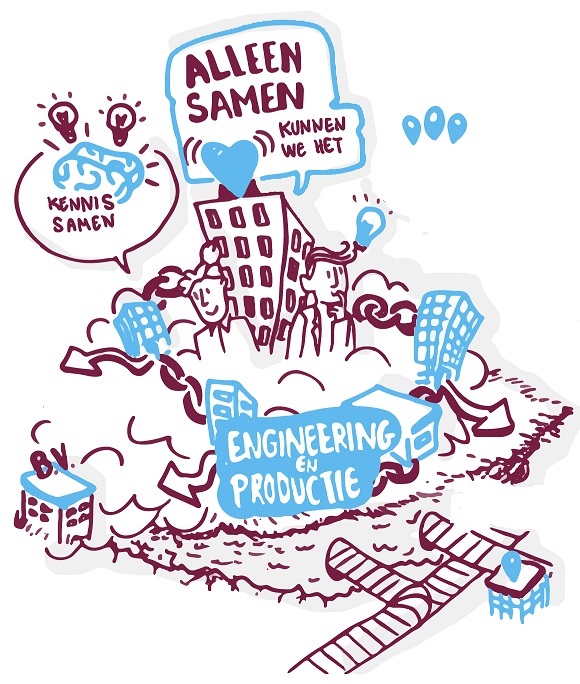 Om de visie van de directie ook duidelijk over te kunnen brengen naar de rest van de organisatie, begeleidde Erik hen bij vervolgsessies met de gangmakers in de organisatie. “In verschillende rondes brachten we met hen samen de toekomst in beeld. Wat betekent dit voor sales? Wat is er nodig op het gebied van de interne communicatie? Welke eisen zijn er voor engineering en productie? En welk HR beleid hoort er bij zo’n organisatie?” De antwoorden hierop werden letterlijk uitgetekend. Met deze manier van visualiseren ontstaan er mooie gesprekken waardoor de beelden uiteindelijk steeds meer op elkaar gaan lijken.