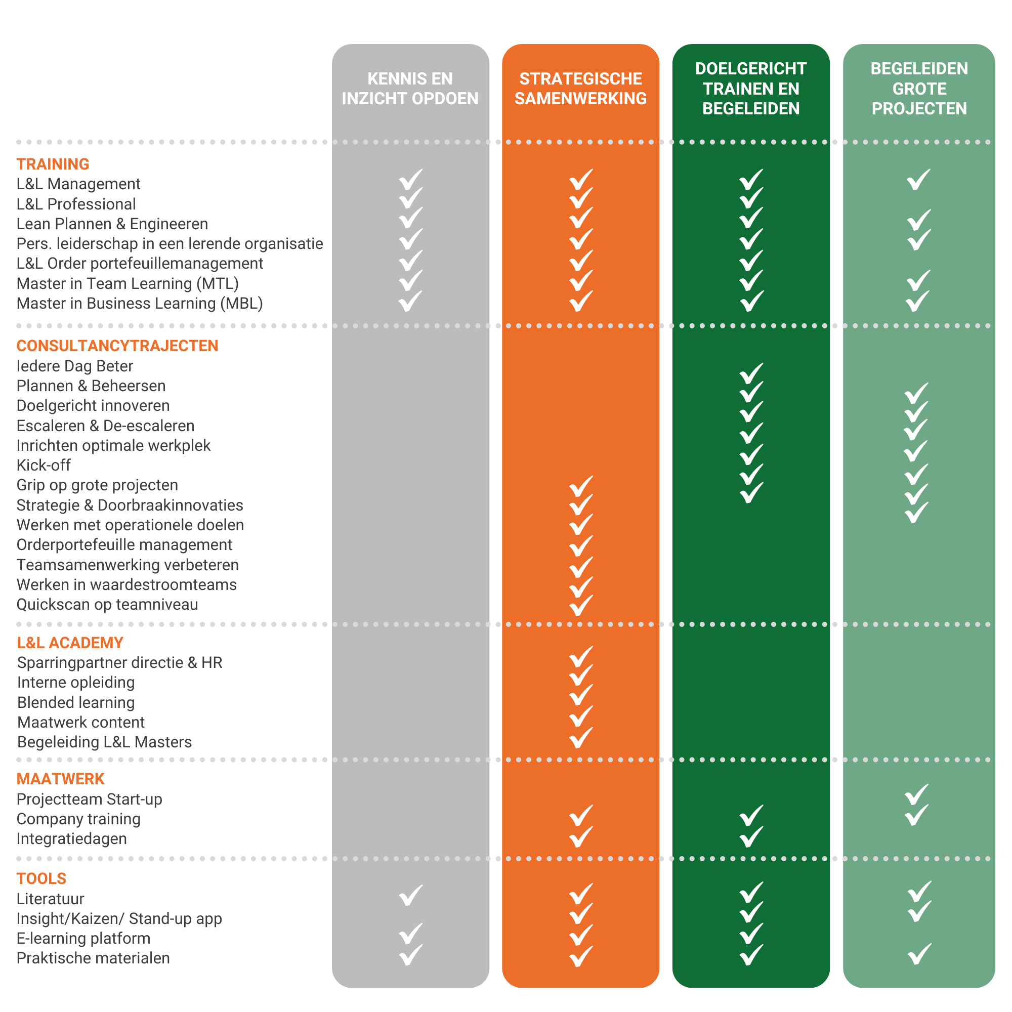Het allerliefst gaan we voor een strategische samenwerking met directeur-eigenaren, manager en professionals om de Iedere-Dag-Beter-aanpak in het DNA van de hele organisatie te krijgen. We zijn ervan overtuigd dat dat de beste manier is om duurzaam te transformeren in een wendbare en innovatieve organisatie.