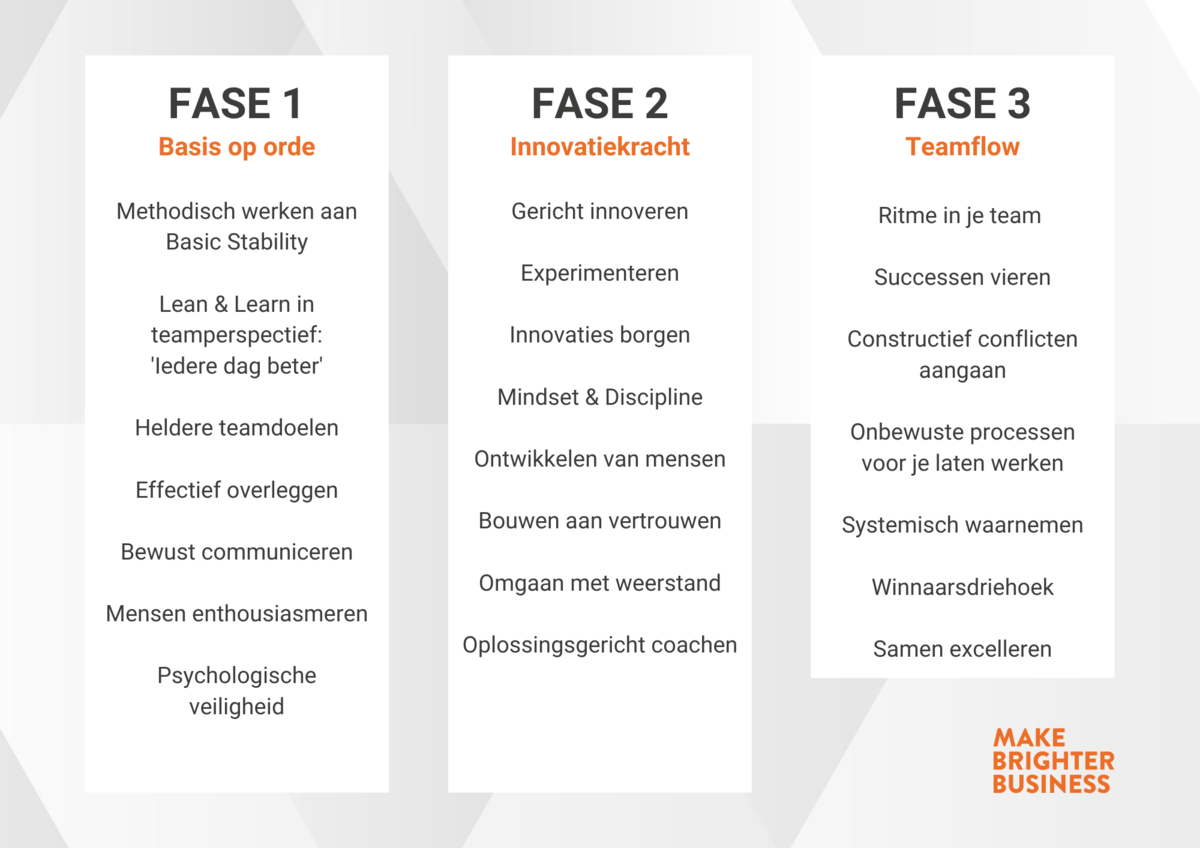 Je begint in de MTL met de basis (nog meer) op orde te krijgen in je team(s): het creëren van Basic Stability en het verbeteren van de onderlinge samenwerking en communicatie. Onderweg ontwikkel je de innovatiekracht ván en mét je team(s). De gedurende het traject opgedane kennis en ervaringen pas je direct toe in de praktijk. Zo raken jij en je team(s) in flow. Na twee jaar heb je jezelf getransformeerd tot een coachende leider en heb je de Iedere-Dag-Beter manier van werken ingebed in je team(s). Processen lopen soepeler, de teamleden werken prettiger samen en er is focus op continue innovatie.
