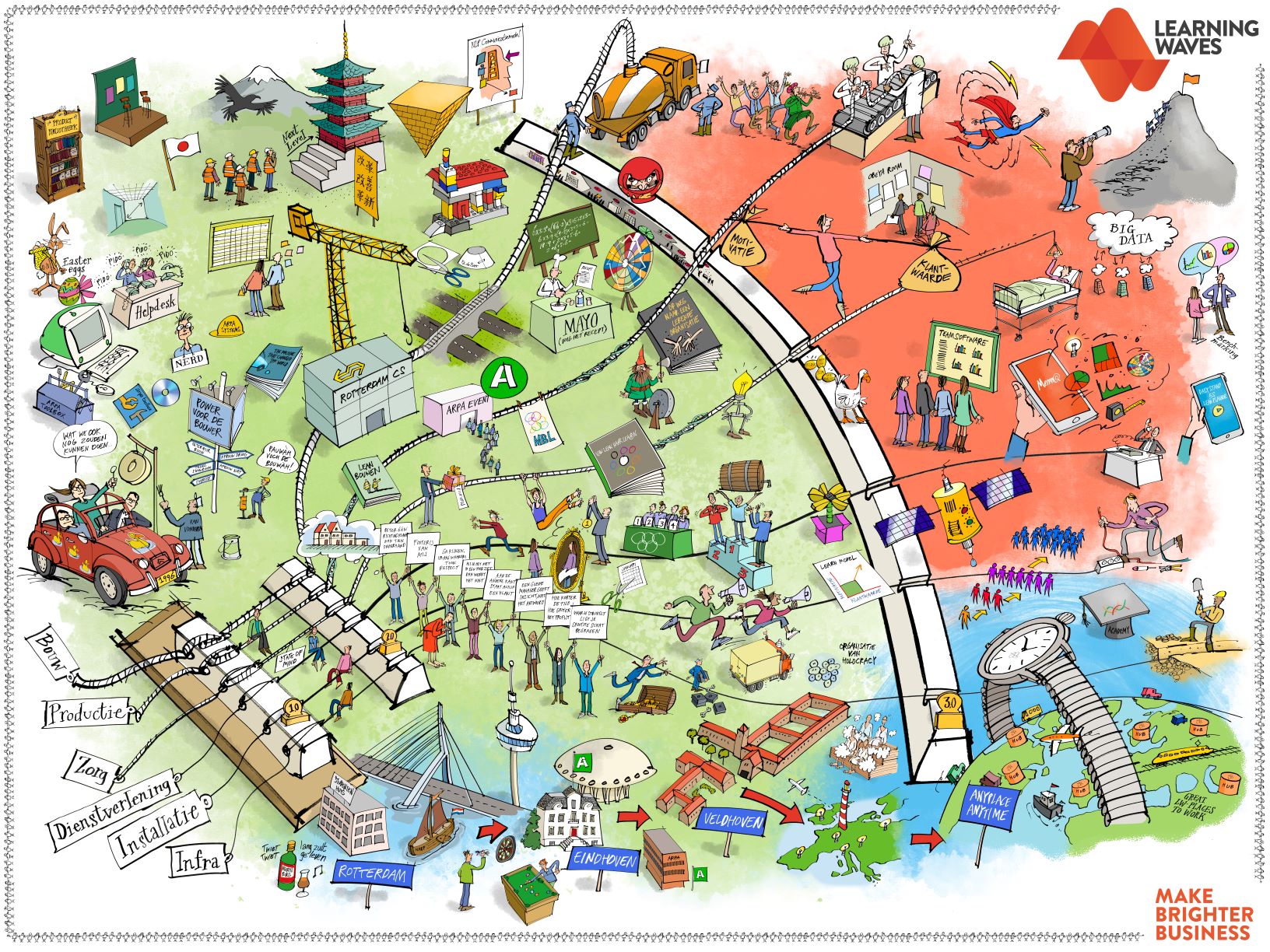 Met LearningWaves helpen we DGA's, leidinggevenden, managers en hun teams duurzaam beter samen te werken. We ruilen organisatorisch gedoe in voor een heldere stip op de horizon, tevreden klanten, intrinsiek gemotiveerde collega’s en een beter bedrijfsresultaat. We begeven ons daarbij ook steeds meer op de werkvloer.